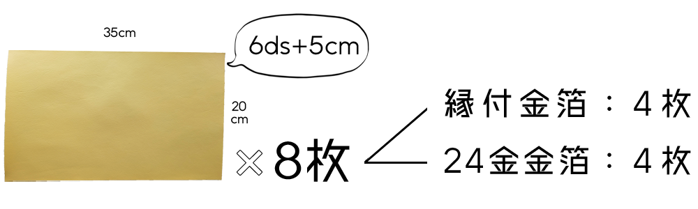 20cm×35cmの革が8枚あり、4枚に「縁付金箔6枚分」を、残りの4枚は全面に24金金箔を貼る場合